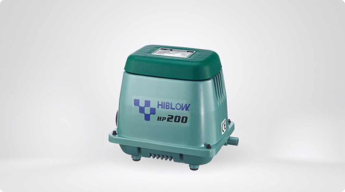 เป็นปั้มลมแบบไดอะแฟรมนำเข้าจากประเทศญี่ปุ่น คุณภาพดี เสียงเงียบ ประหยัดไฟ มีเครื่องเติมอากาศ ยี่ห้อไฮโบว์ (HIBLOW) HP Series